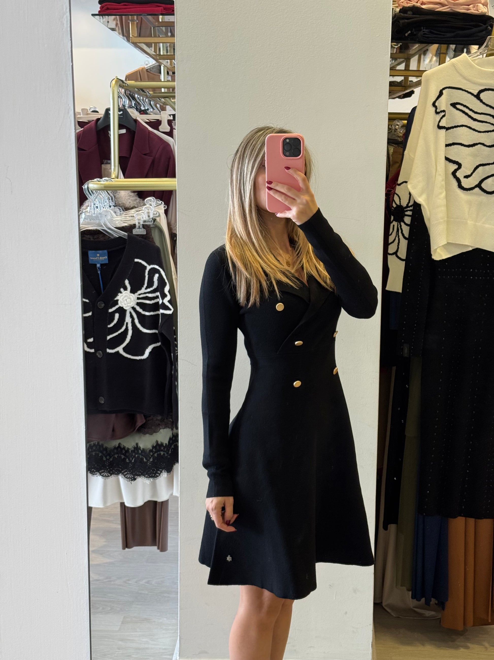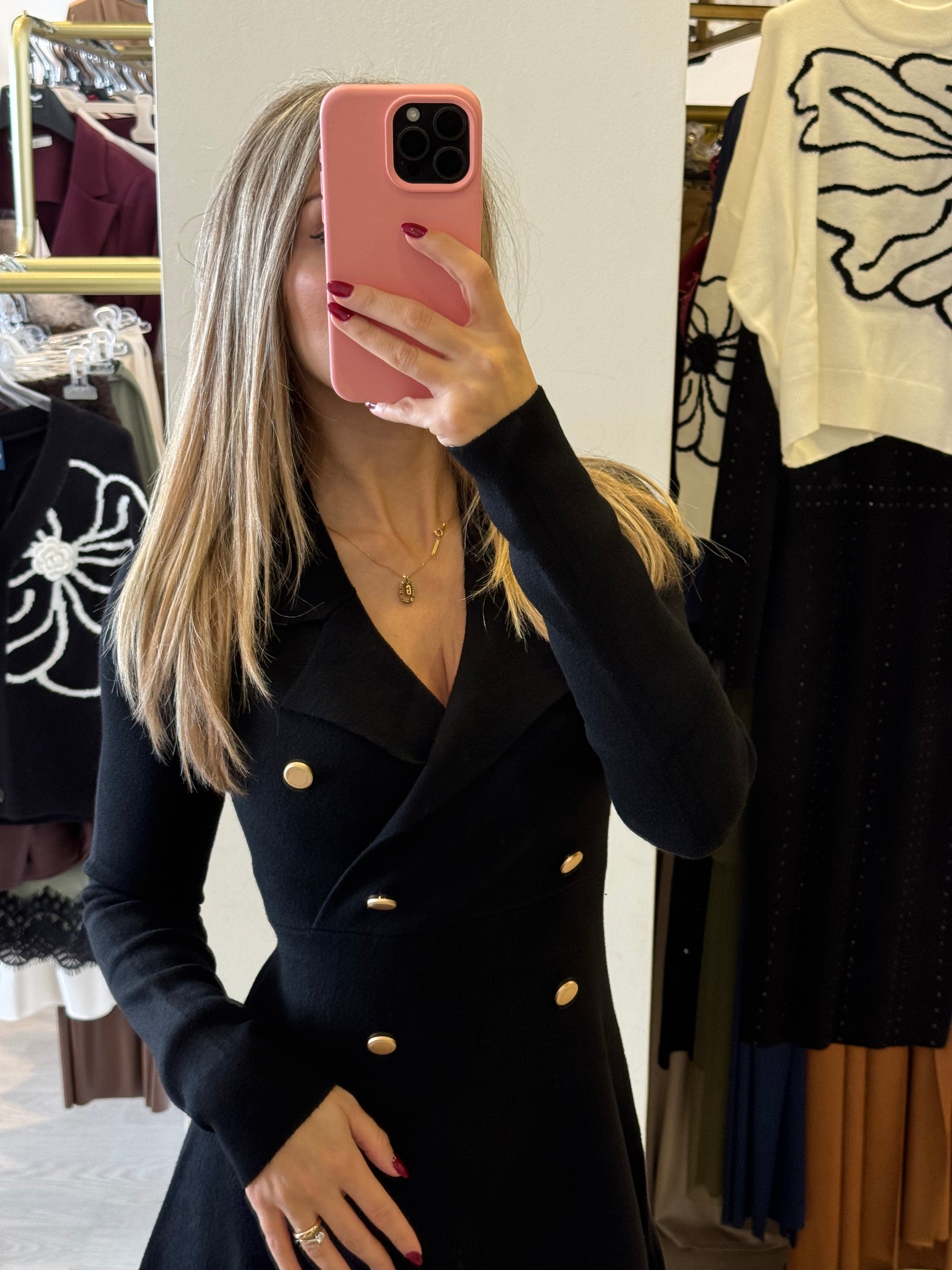Questo abito in maglia combina comfort e calore, ideale per le giornate più fresche. La silhouette aderente valorizza la figura, mentre i dettagli con bottoni dorati modello campana aggiungono un tocco raffinato. Perfetto per ogni occasione, si adatta facilmente a contesti sia casual che più eleganti, garantendo uno stile sempre curato e sofisticato.