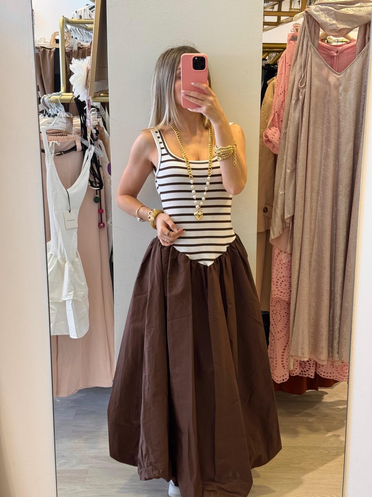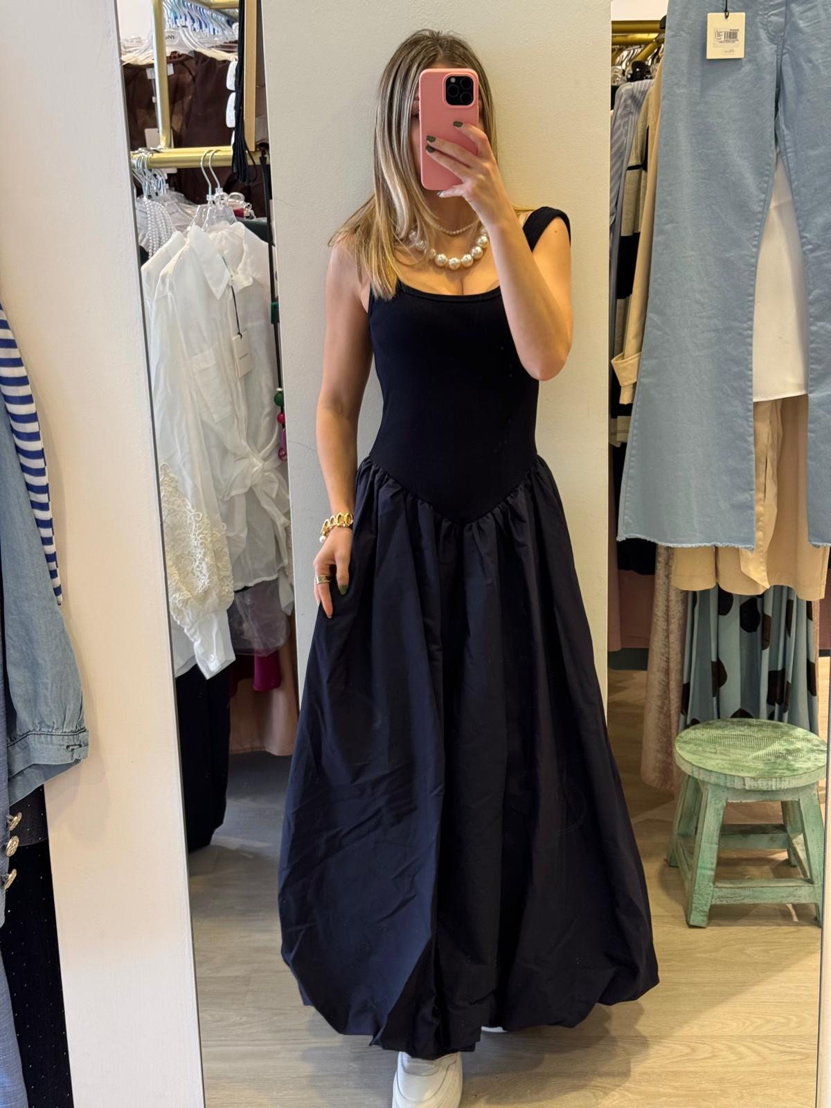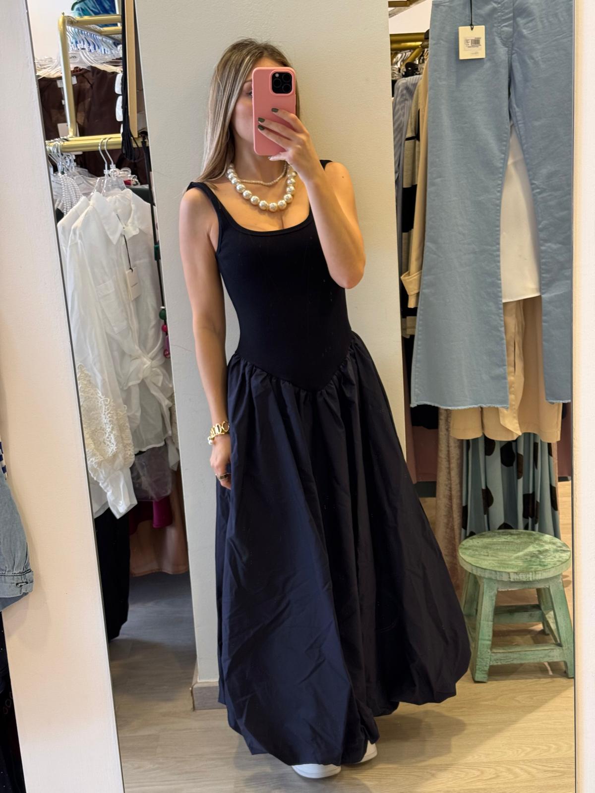 Questo elegante abito Palloncino presenta una struttura bimaterico innovativa: parte superiore in morbida maglina che si fonde con una sezione inferiore in cotone pregiato, creando il caratteristico effetto voluminoso "a palloncino". Il design è impreziosito da uno scollo profondo sul retro che aggiunge un tocco di raffinata sensualità, bilanciando perfettamente comfort e stile ricercato.
