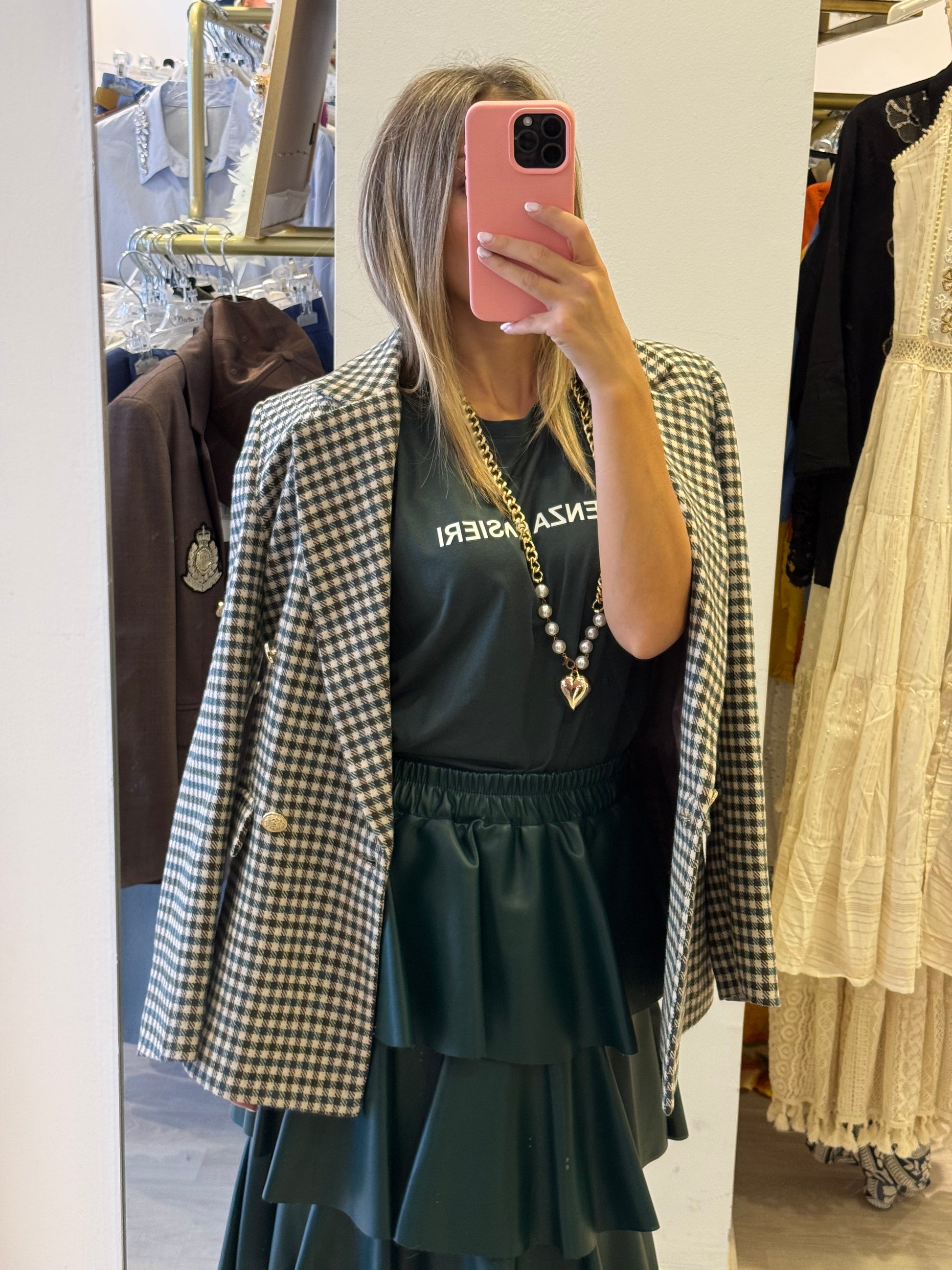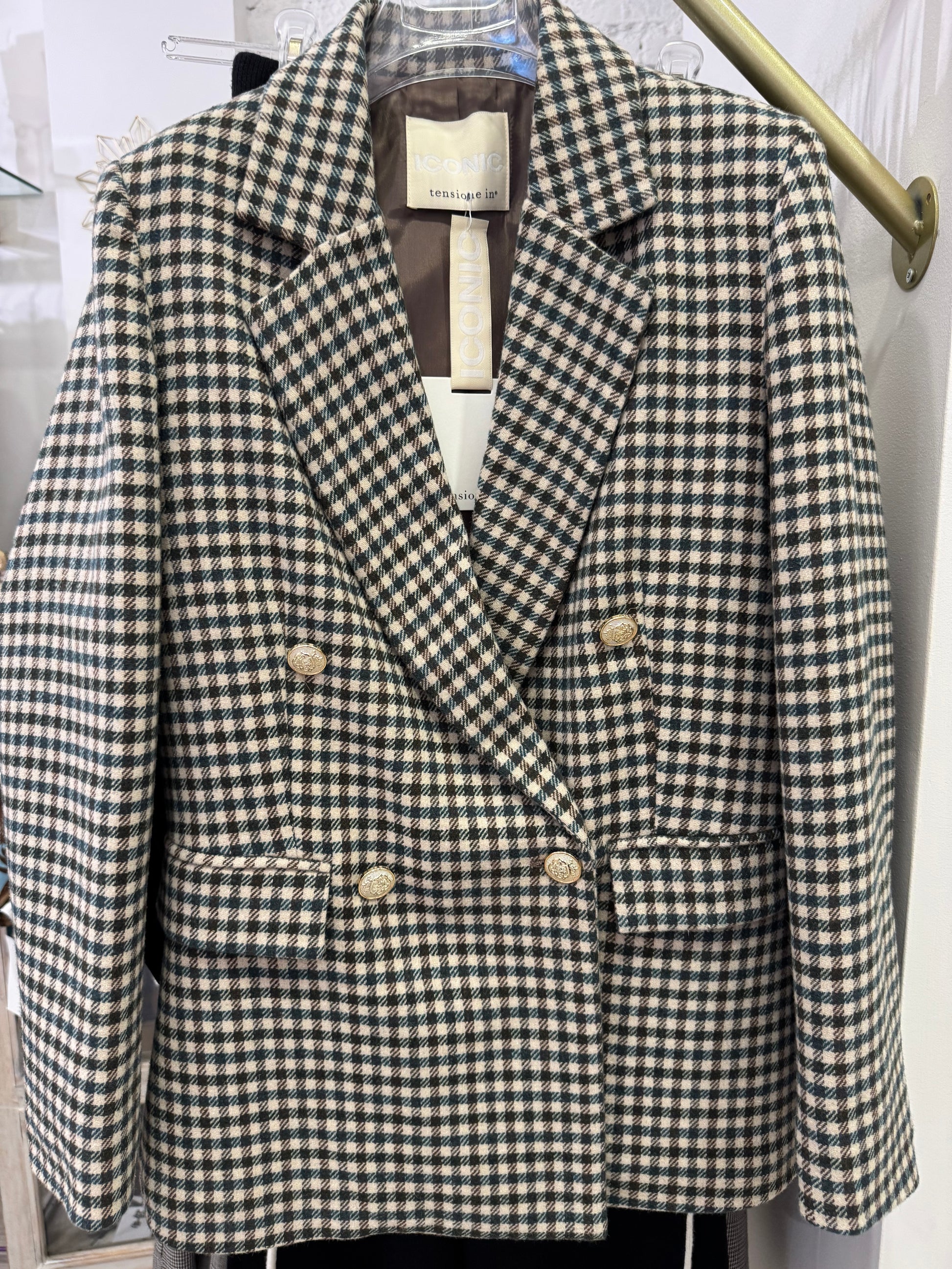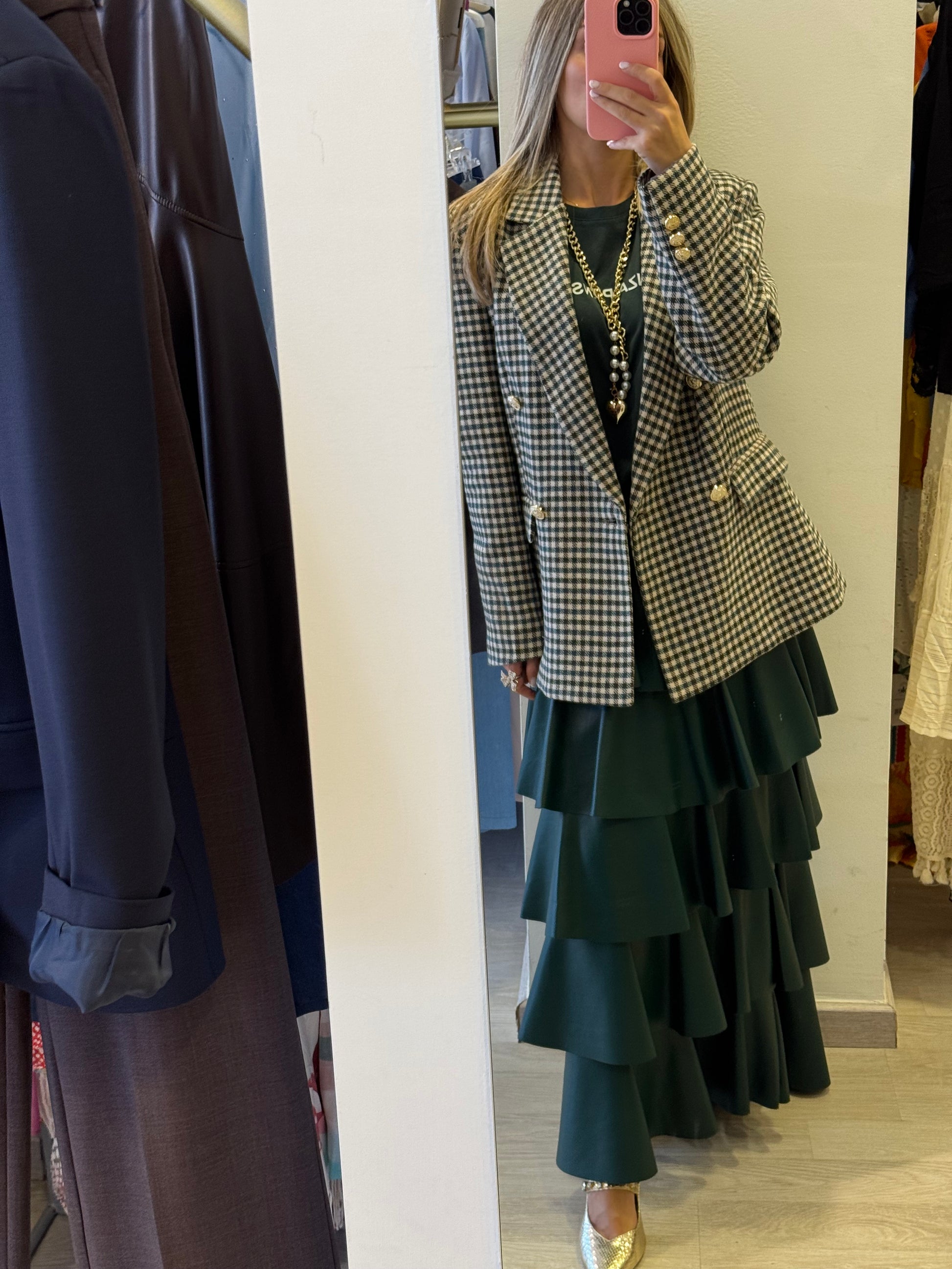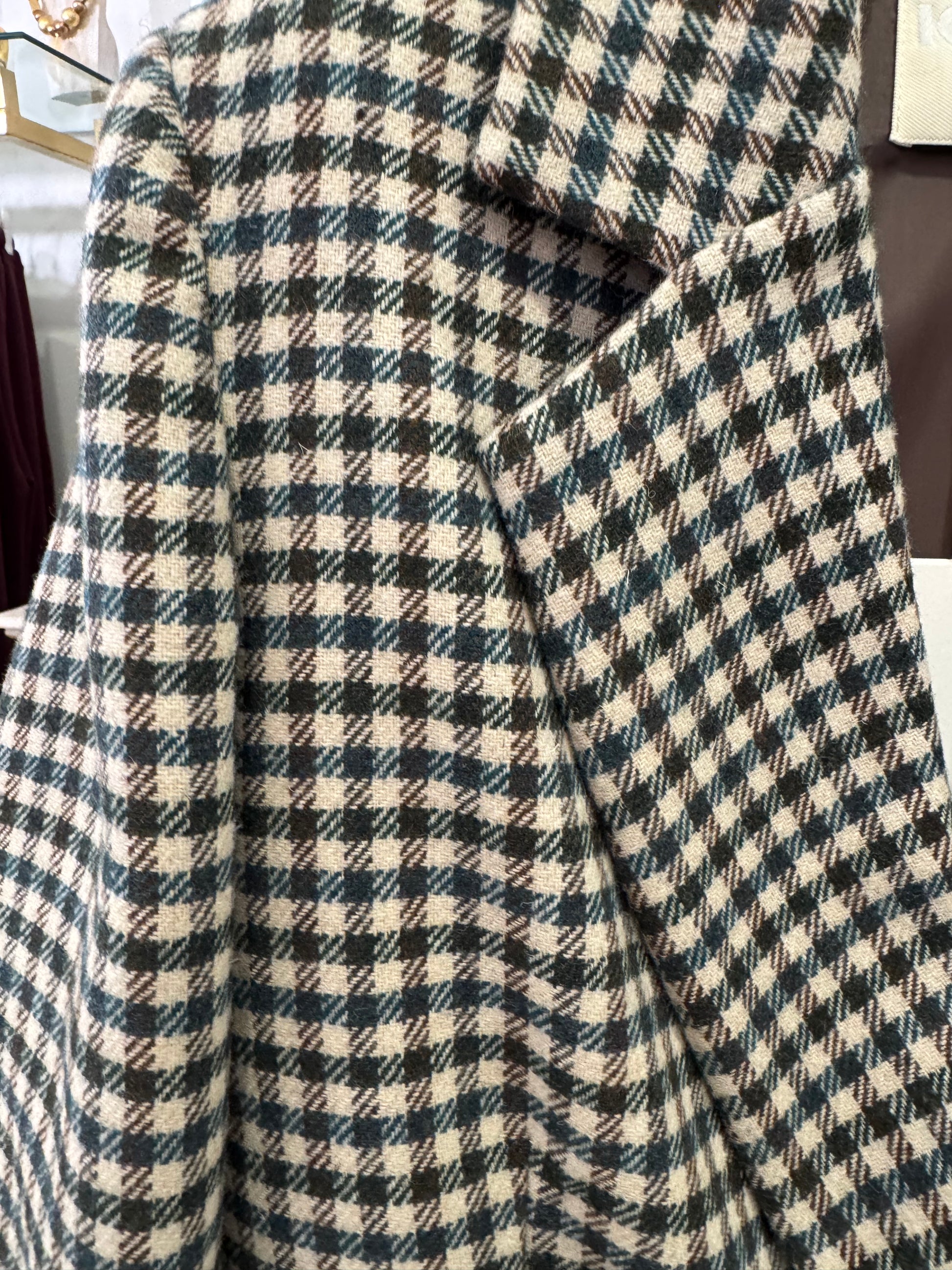 Questa giacca doppiopetto presenta un raffinato motivo a quadri nei toni verde, panna e marrone, realizzata in lana rasata di alta qualità. Il taglio sagomato valorizza la silhouette, mentre il tessuto garantisce comfort termico e un aspetto elegante. Perfetta per chi cerca un capo versatile e distintivo da indossare in contesti formali o professionali.