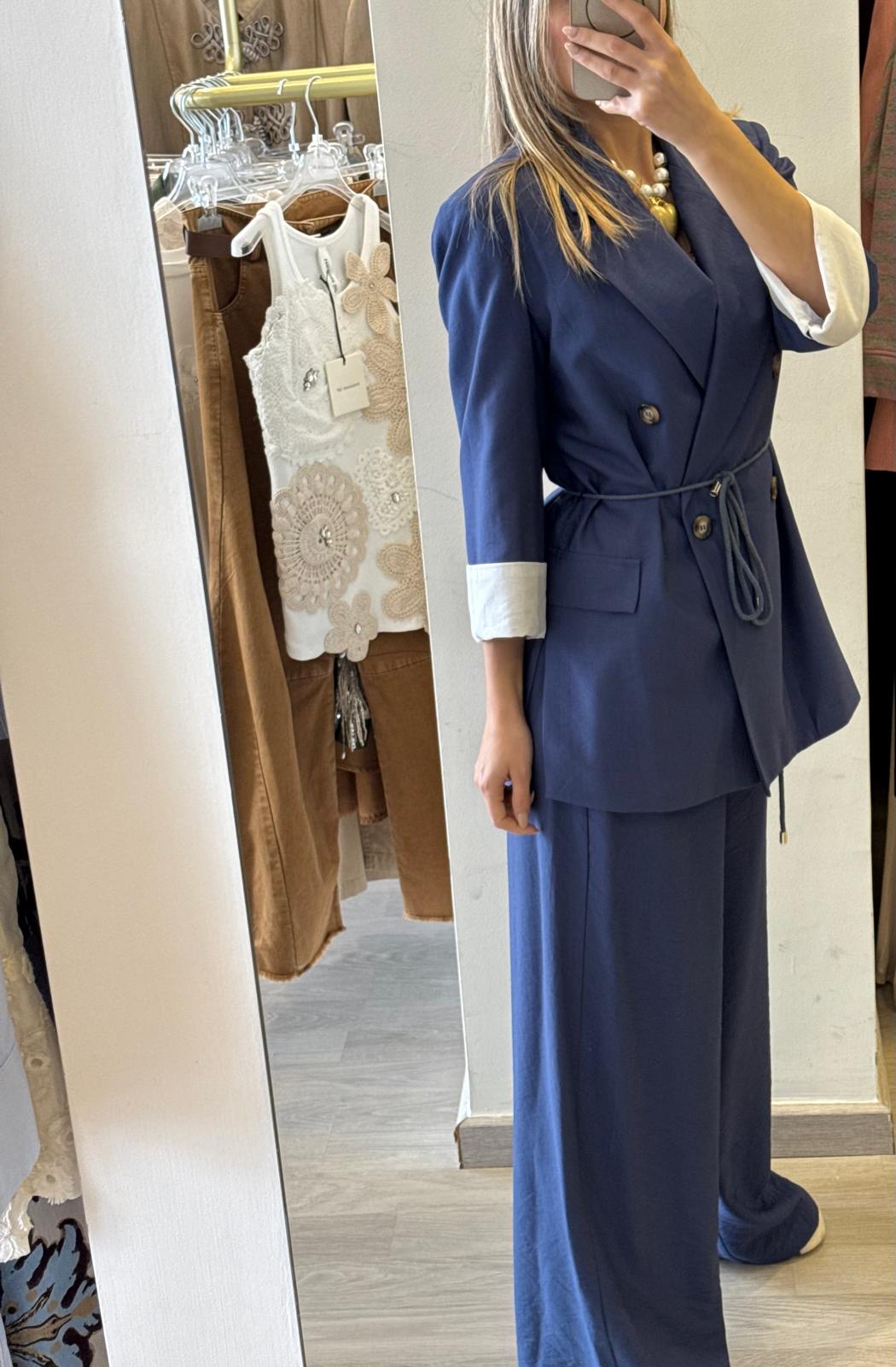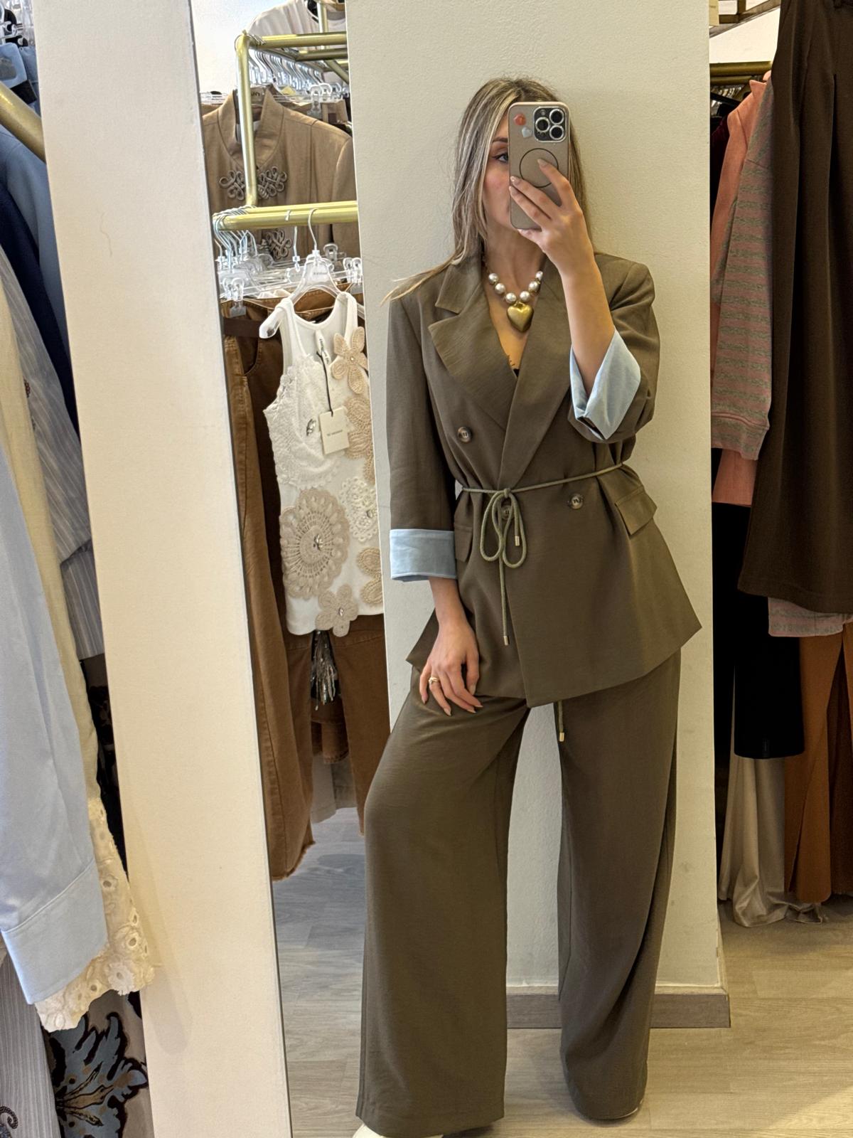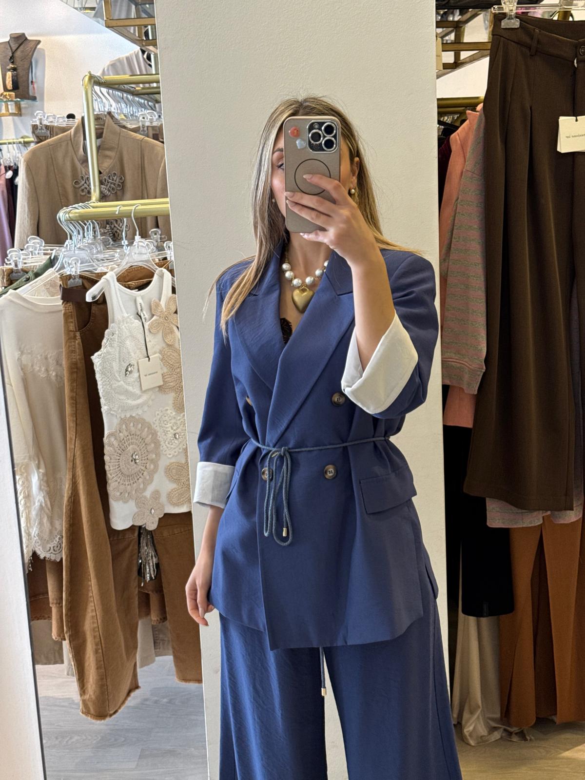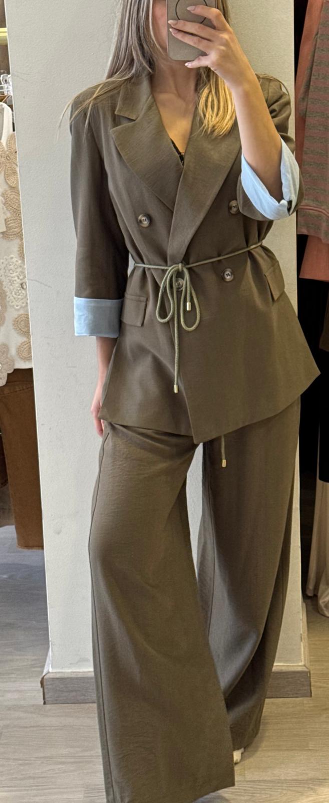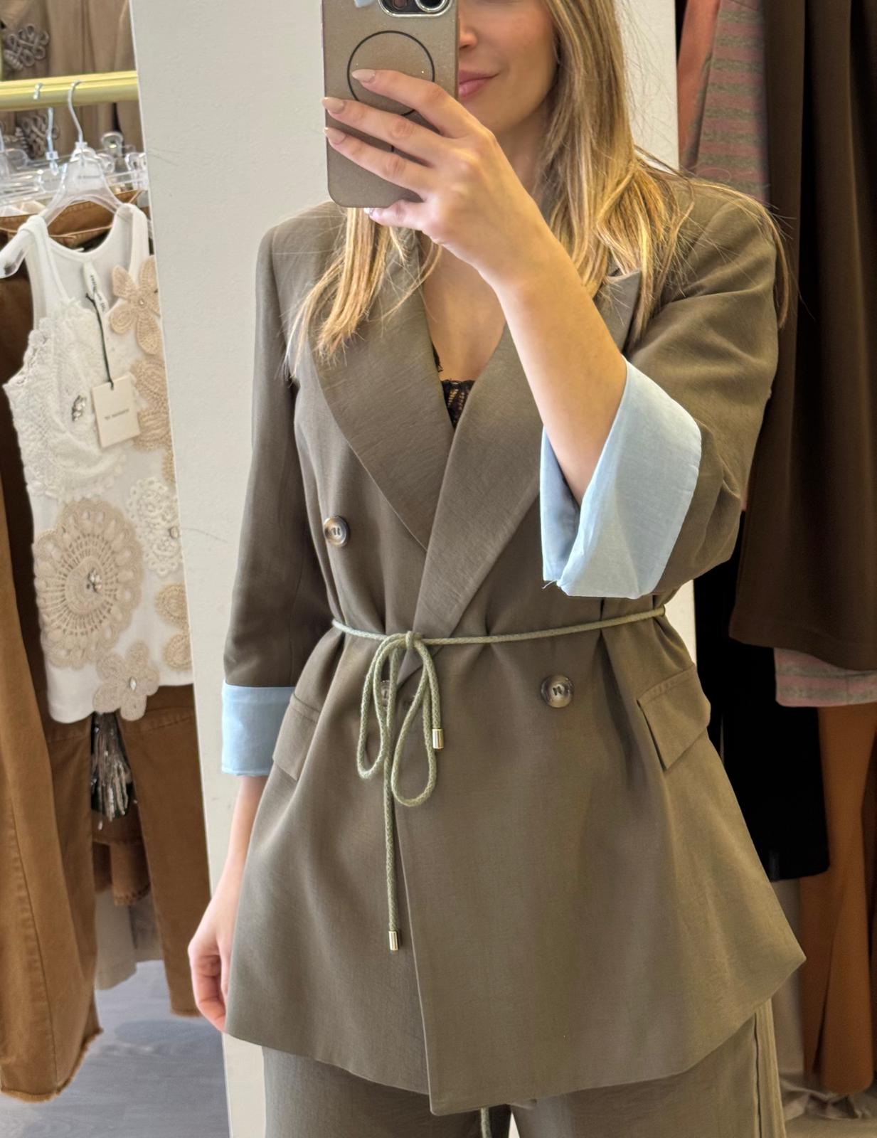 Giacca doppiopetto dal design sofisticato, caratterizzata da un elegante cinturino in corda che definisce la silhouette. Il risvolto strutturato aggiunge profondità e movimento al capo, creando un look raffinato e versatile. Perfetta per occasioni formali o per elevare uno stile casual con un tocco di classe. Realizzata con attenzione ai dettagli, questa giacca è un pezzo essenziale per una guardaroba consapevole.