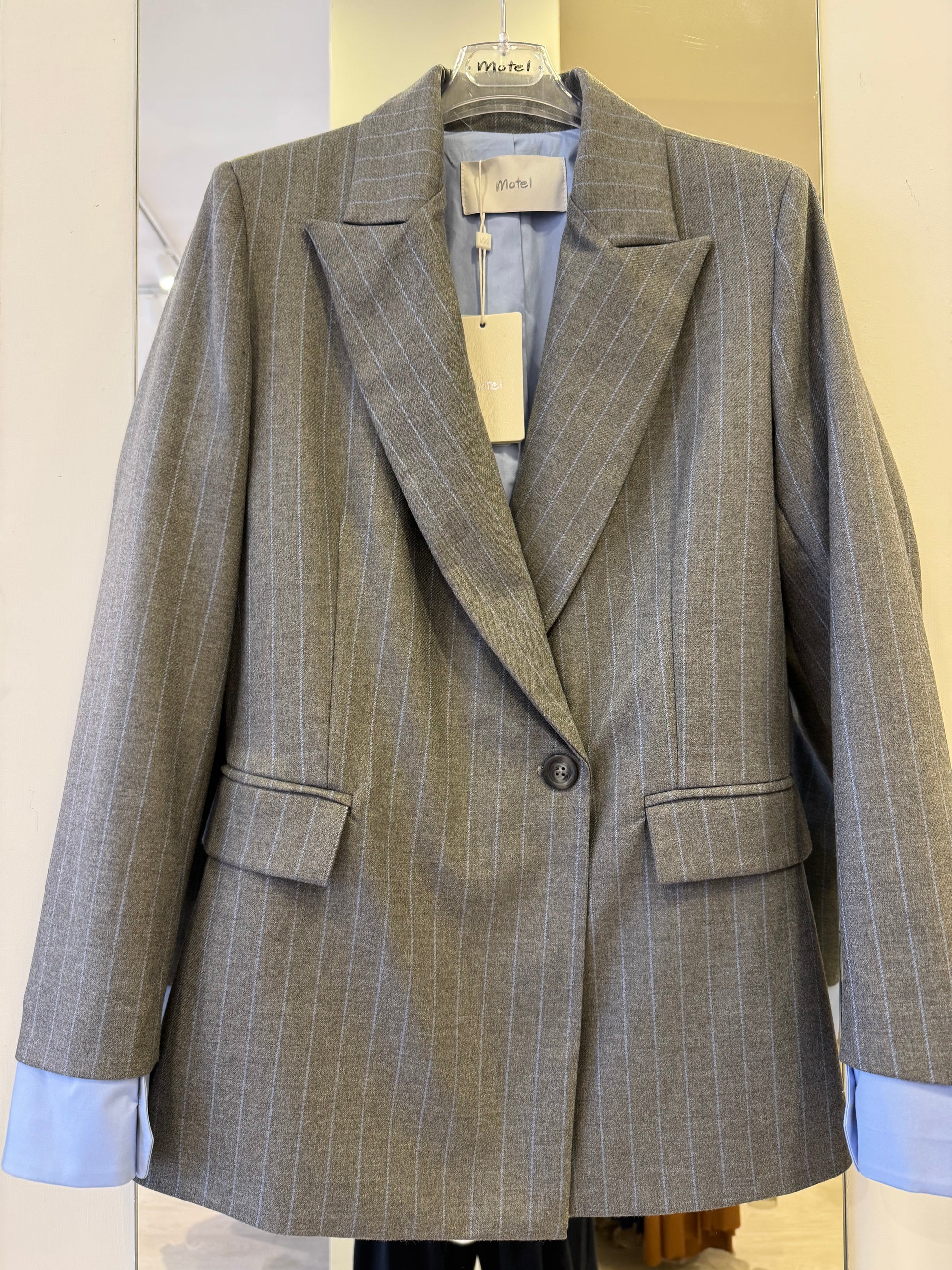 Giacca doppiopetto gessata in lana rasata caratterizzata da una sottile righina azzurra che ne valorizza il design classico. I polsi sono impreziositi da un tessuto in cotone azzurro modello camicia, facilmente estraibile per un dettaglio discreto ma distintivo. Un capo che combina materiali pregiati e funzionalità per un’eleganza senza tempo.