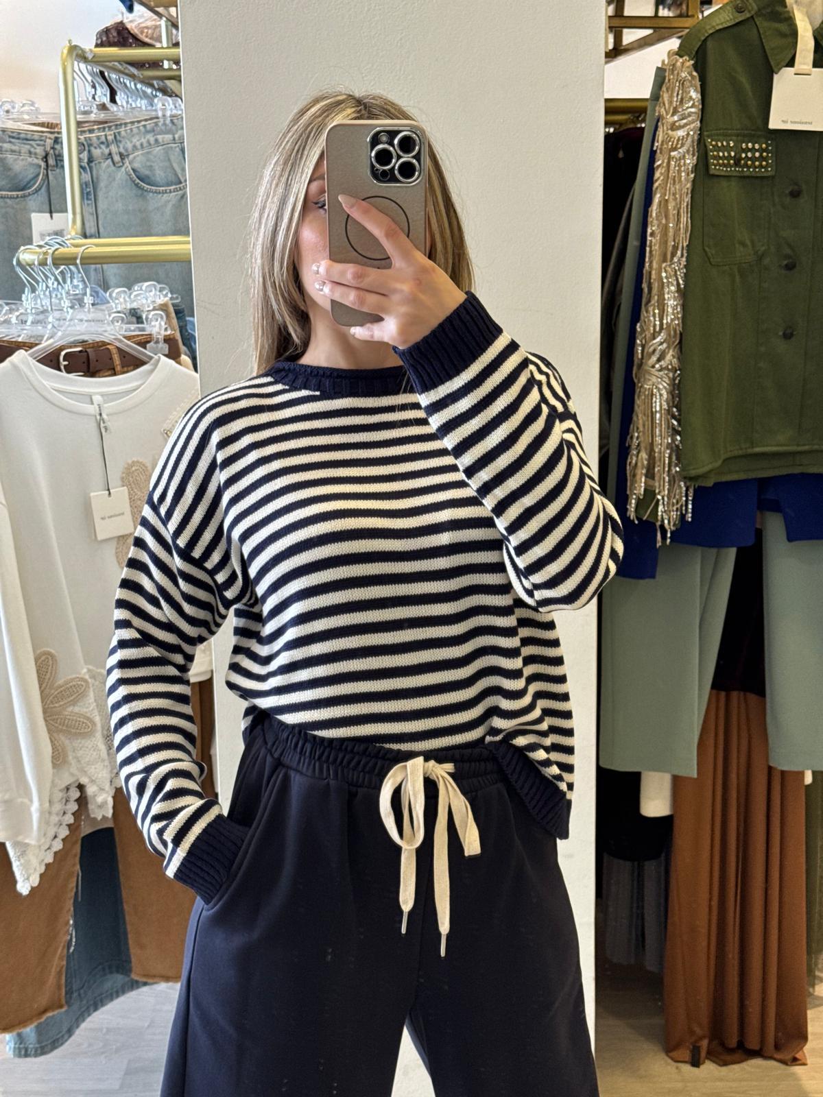 Maglia primaverile a righe dal taglio classico con scollo a giro. Realizzata in cotone di qualità, garantisce comfort e traspirabilità durante le giornate più miti. Il pattern a righe orizzontali conferisce un'estetica senza tempo, perfetto per composizioni versatili dal casual al smart-casual. Ideale da indossare da sola o in layering con giacche leggere. Un essenziale di stagione che non manca mai in un guardaroba ben strutturato.