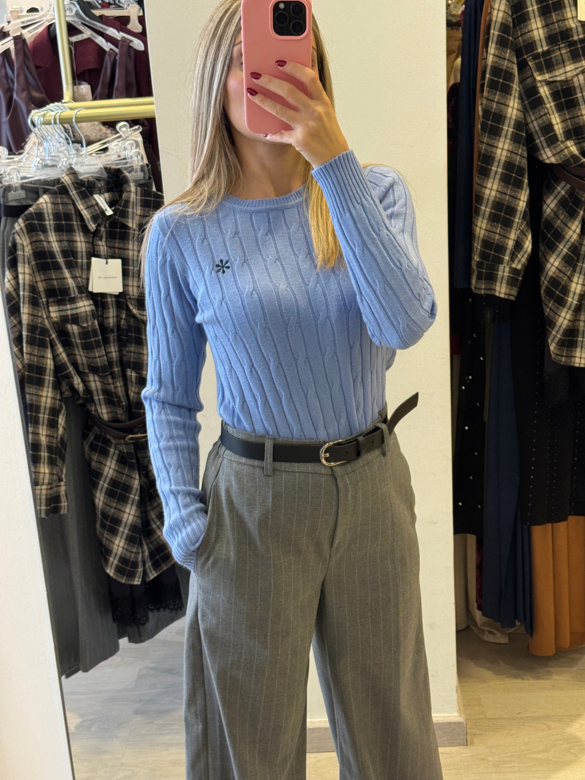 Questo pantalone gessato in lana rasata unisce stile e comfort con la sua morbidezza e la vestibilità regolare. Il taglio a gamba dritta e il motivo grigio con sottili righine azzurre donano un aspetto raffinato, ideale per ambienti formali o professionali. La cintura inclusa completa il design, garantendo una calzata personalizzata e un look curato.